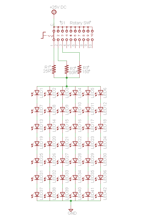Afin que les DELS soient le plus efficaces possible, j'ai fait une combinaison série-parallèle. Avec une source de 25 volts DC et une perte de voltage de 3.5 volts, je pouvais donc mettre 6 DELS en série (LED 3.5 V * 7 = 24.5 V). Seulement 10W sont nécessaires pour allumer 42 DELS. Mon seul regret est de ne pas avoir vérifié la couleur d'une DEL avant de les installer. J'avais fait mes tests avec des DELS beaucoup plus blanches et moins bleutées que celles achetées sur Ebay.