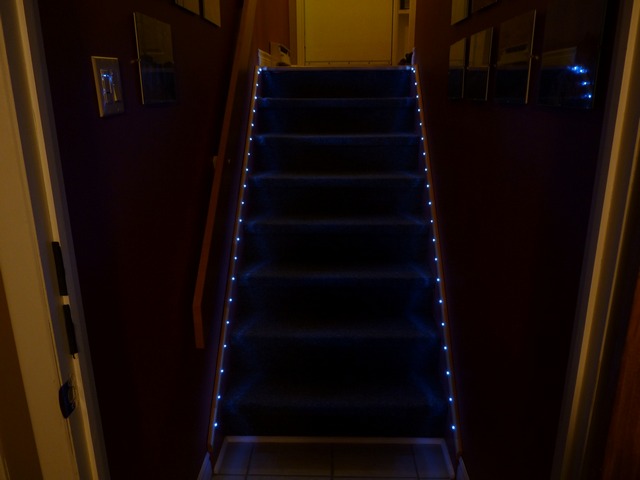 Le cinéma maison dans le sous-sol c'est bien le fun, mais sans un escalier éclairé ça n'a pas de sens! Voilà pourquoi, je me suis fait un chemin de lumières de chaque côté des marches. J'ai commandé un sac de LED sur Ebay pour quelques dollars. J'ai utilisé 2 morceaux de pin dans lesquels j'ai fait une rainure pour y passer le filage. Le tout est relié au circuit qui est composé principalement d'une source 25 volts DC avec un interrupteur qui change l'intensité de la lumière.