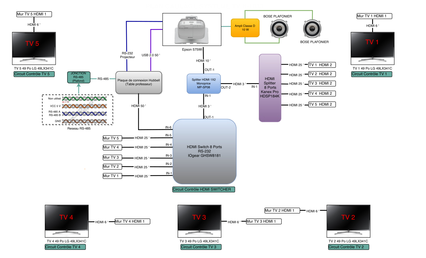 Afin de pouvoir controller les téléviseurs d'une salle multifonctions j'ai monté un réseau RS-485 qui envoie des commandes aux téléviseurs. L'avantage du RS-485 est d'être un circuit balancé, donc on peut faire de longues distances sans avoir à s'inquiéter pour le bruit et les interférences.Les commandes sont envoyées à tous les équipements en même temps. J'ai utilisé le compilateur XC8 que Microchip fournis gratuitement pour faire le code du boitier de contrôle.