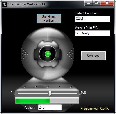 Le contrôle du moteur se fait via le port série avec une petite application que j'ai développé avec Visual Basic. La communication entre le PIC et le PC débute par une requête pour avoir la dernière position du moteur qui est sauvegardé dans le EEPROM du PIC. Tenir le moteur en fonction demandait un bon 700 mA. J'ai donc mis un "timer" dans le code du PIC afin qu'au bout de 3 minutes sans activité le moteur soit relâché.